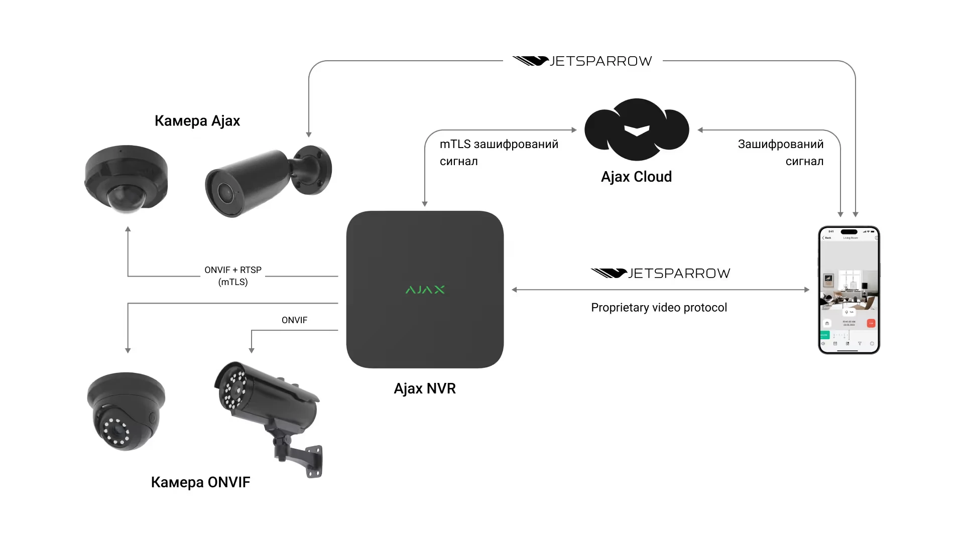 - потокове відео передається через пропрієтарну технологію JetSparrow, захищену TLS-шифруванням;